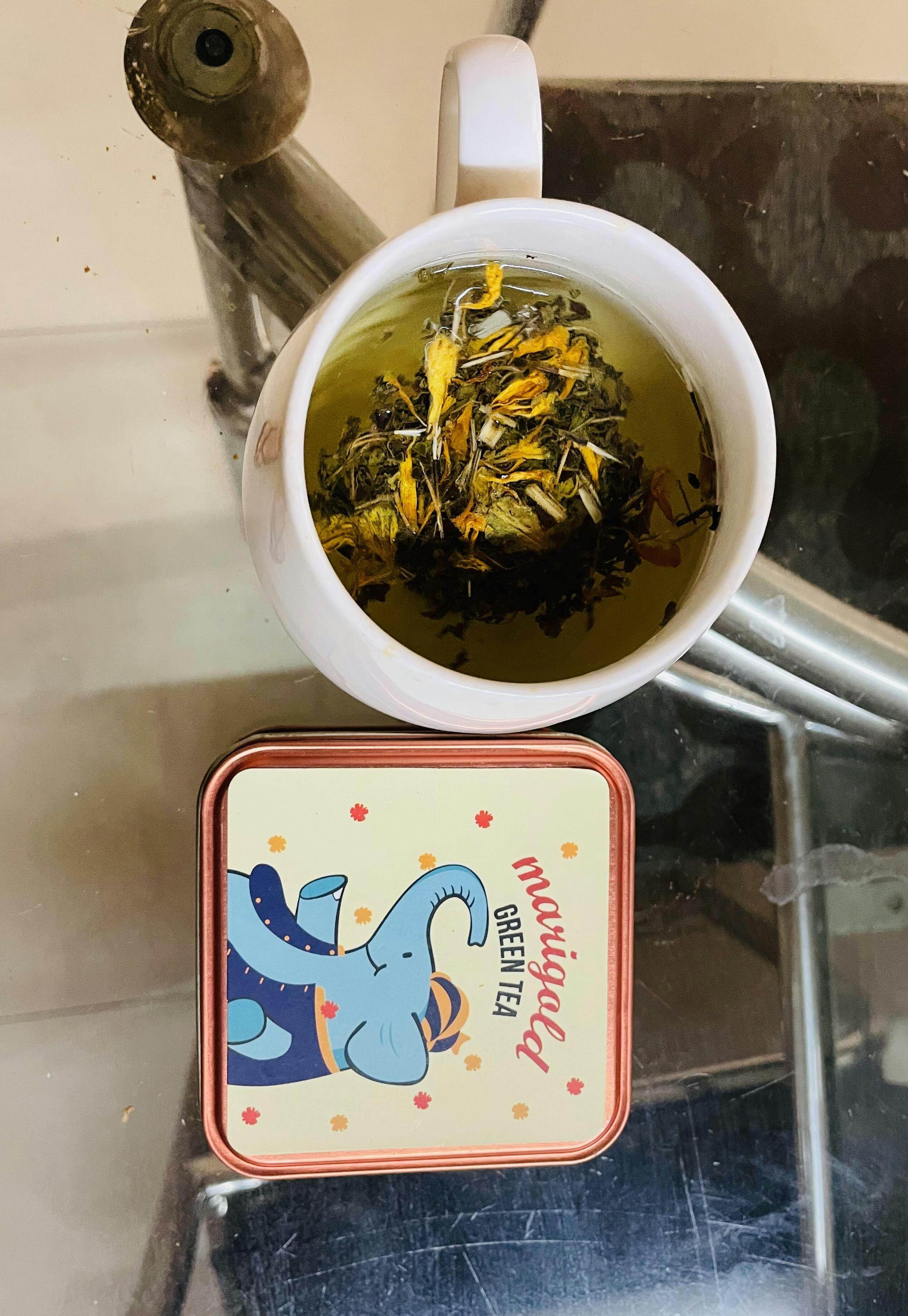 Calendula, commonly known as marigold flower, brings its antiseptic properties to this vibrant blend, aiding in wound healing and acne prevention. Marigold Green Tea is renowned for stimulating collagen production and aid in reducing the occurrence of dry skin. Enhanced with lemongrass, which is loaded with Vitamins A and C, this tea tastes as great as it sounds.